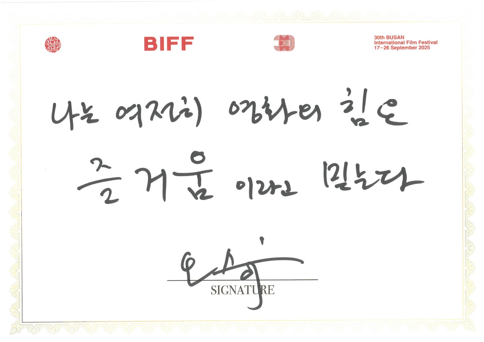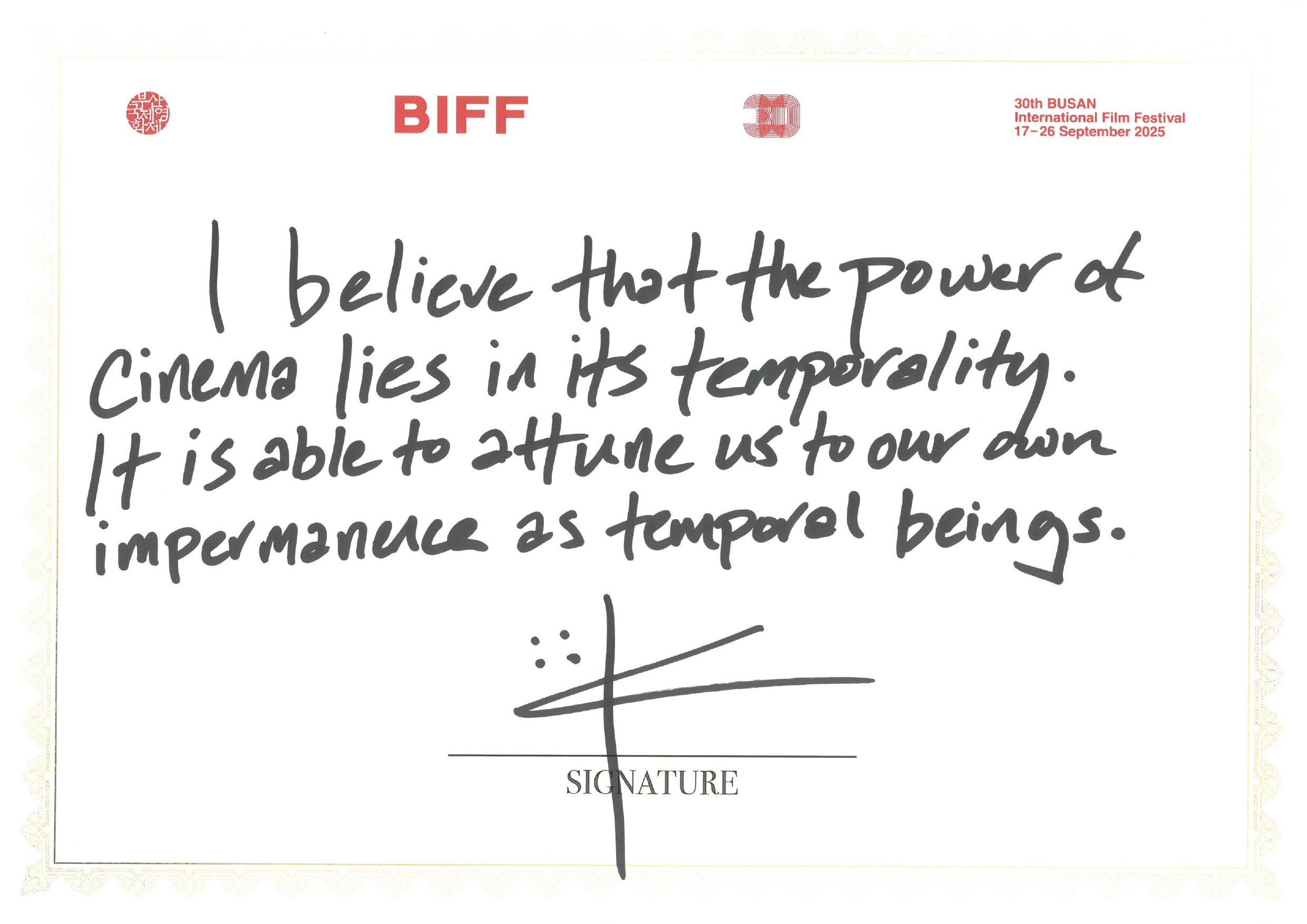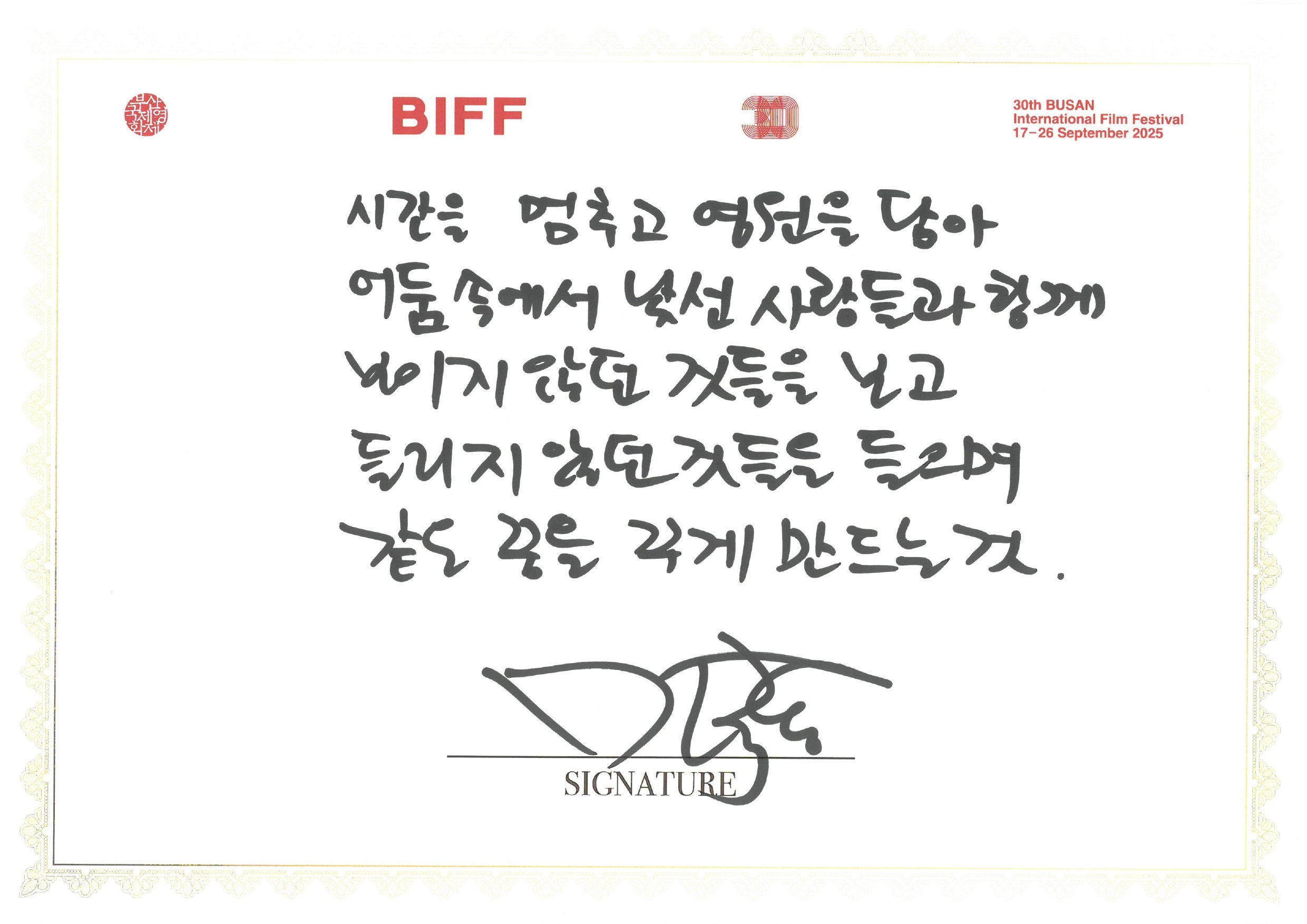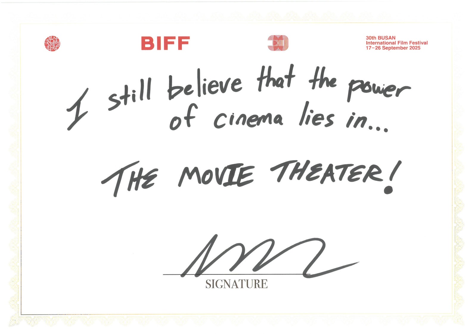 9월 17일(수)부터 26일(금)까지 열흘간 7천여 명의 게스트와 22만여 관객이 오직 영화만을 위해 ‘영화의 바다’ 부산을 찾았습니다. 제30회 부산국제영화제는 그 뜨거운 시간 속에서 관객과 영화인을 대신해 21인의 시네아스트에게 질문을 건넸습니다. 그들이 친필로 전하는 ‘영화의 힘’과 비하인드 컷을 공개합니다.