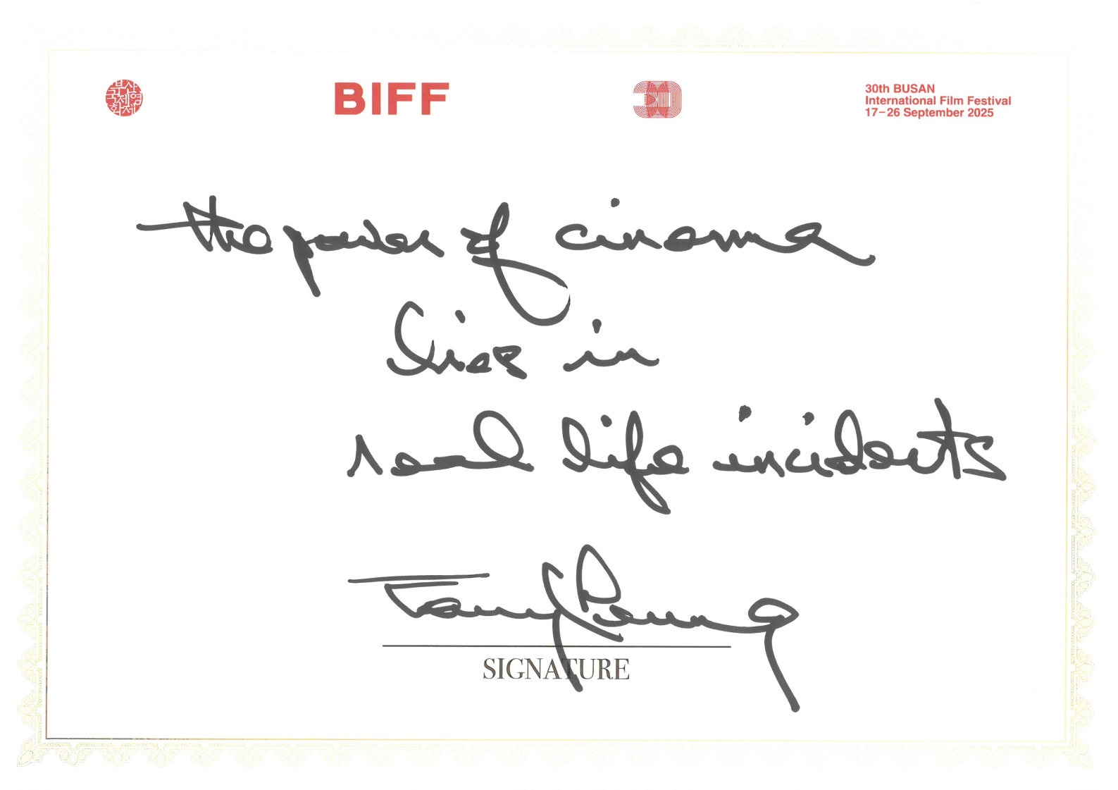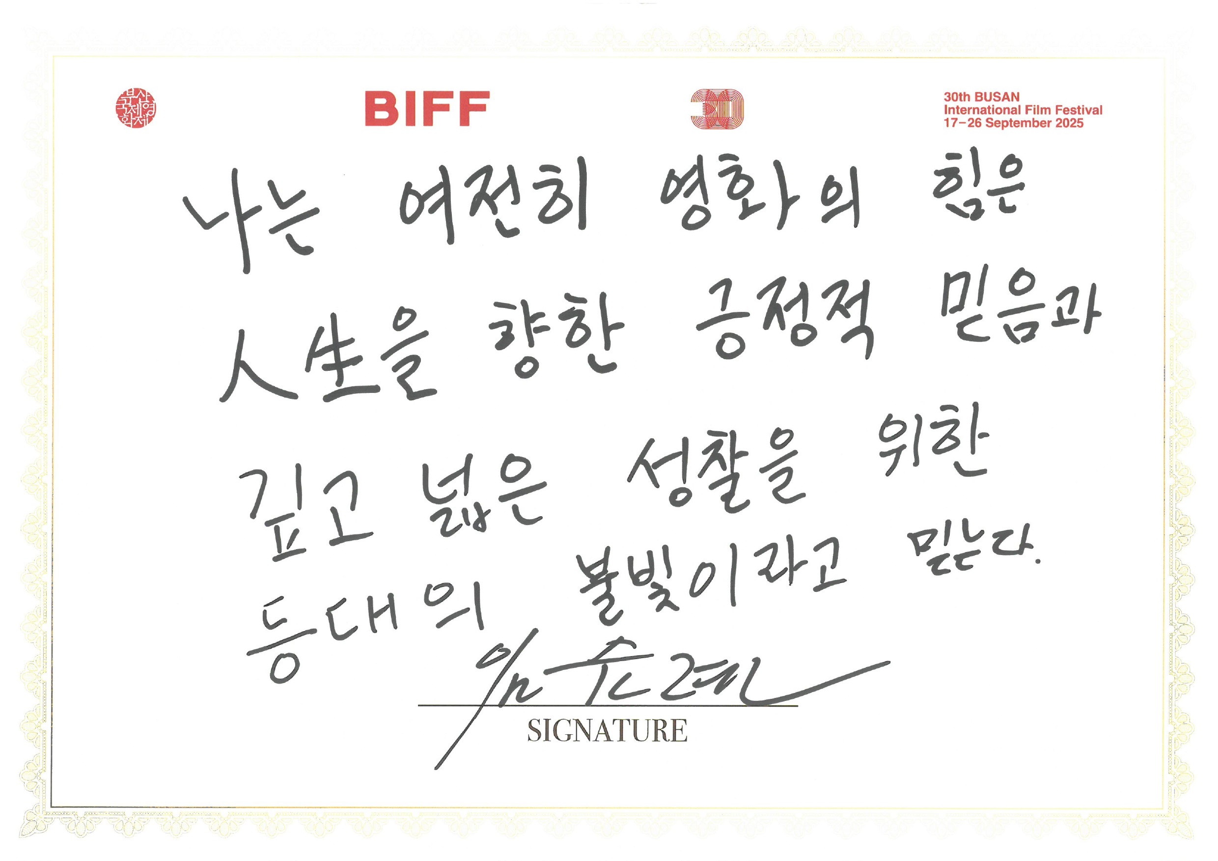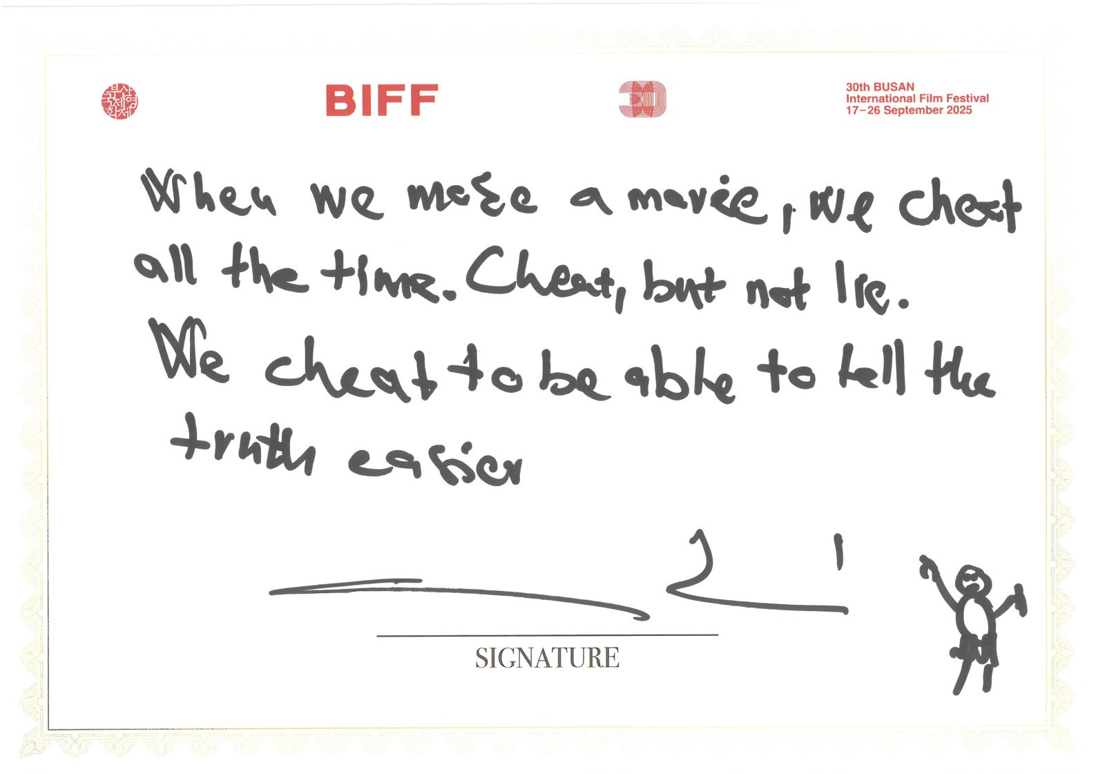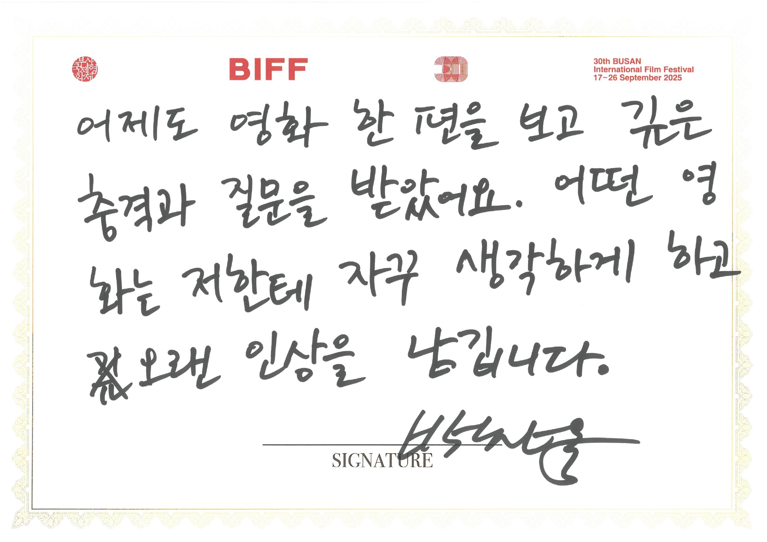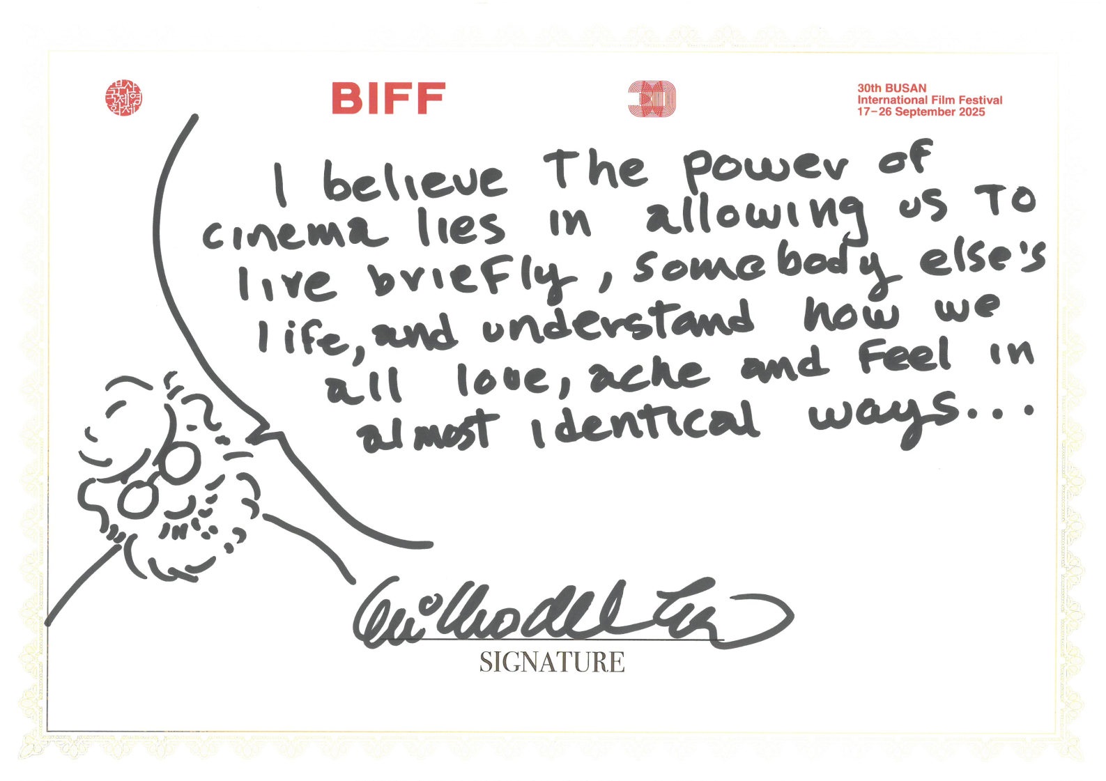 9월 17일(수)부터 26일(금)까지 열흘간 7천여 명의 게스트와 22만여 관객이 오직 영화만을 위해 ‘영화의 바다’ 부산을 찾았습니다. 제30회 부산국제영화제는 그 뜨거운 시간 속에서 관객과 영화인을 대신해 21인의 시네아스트에게 질문을 건넸습니다. 그들이 친필로 전하는 ‘영화의 힘’과 비하인드 컷을 공개합니다.
