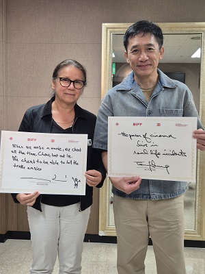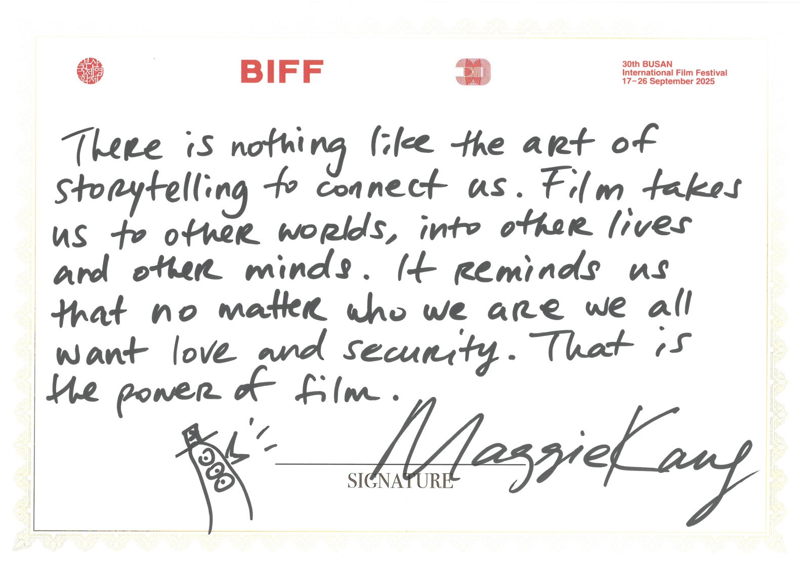 매기 강 | “이야기의 예술만큼 서로를 이어주는 건 없다. 영화는 우리를 다른 세계와 다른 삶, 그리고 다른 마음으로 이끌며, 결국 누구나 사랑과 안정감을 원한다는 것을 상기시킨다. 이것이 영화의 힘이다.” |